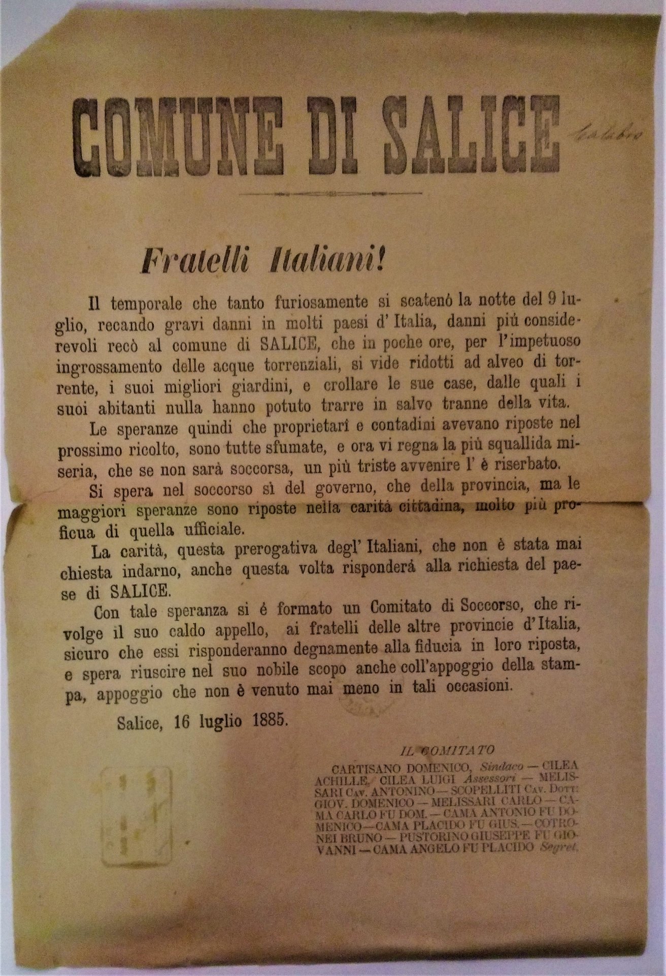 Comune di Salice (Calabro). Fratelli Italiani! Il temporale che tanto furiosamente si scateno' la notte del 9 Luglio...... Salice, 16 luglio 1885
