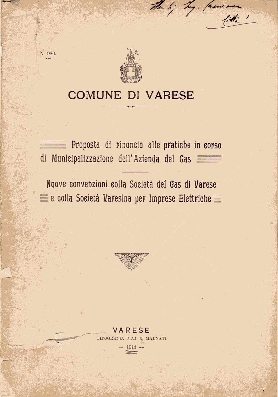 Comune di Varese - Proposta di rinuncia alle pratiche in corso di Municipalizzazione dell'Azienda Gas - Nuove convenzioni colla Società del Gas di Varese e colla Società Varesina per le imprese Elettriche