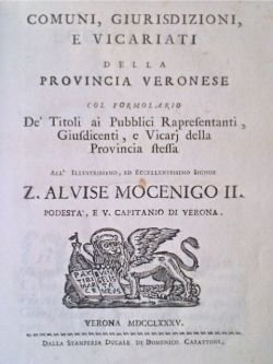 Comuni, Giurisdizioni, e Vicariati della Provincia Veronese col formolario de' Titoli ai Pubblici Rapresentanti, Giudicanti, e Vicari della Provincia stessa.