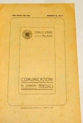 Comunicazioni ai signori medici. Periodico n. 293, Tipografia Opizzi Corno e C., Milano 1907, pp. 207, ill. b.n., cm 22, br. ed. Periodico pubblicato dalla ditta farmaceutica Carlo Erba, di Milano. Tracce d'uso alla brossura, anno di pubblicazione manoscritto sulla copertina e sulla prima pagina, titolo manoscritto con elegante grafia al dorso, per il resto esemplare in buono stato di conservazione.