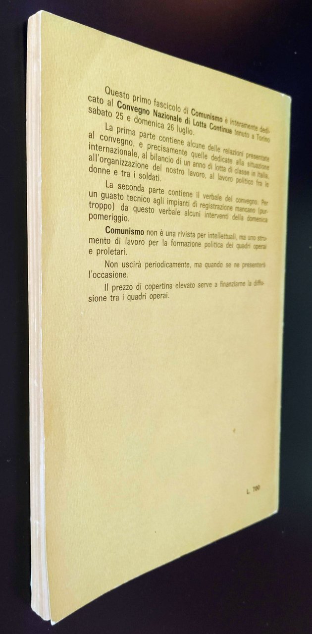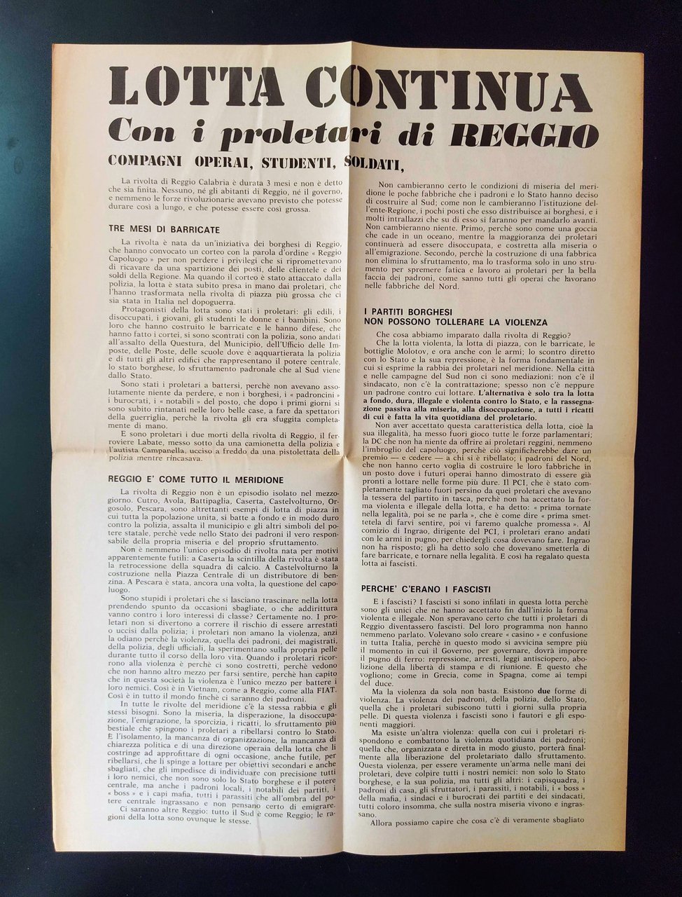 Contiene gli atti e gli interventi del Convegno nazionale di Lotta continua svoltosi a Torino il 25 e 26 luglio 1970. Allegato manifesto "Lotta Continua. Con i proletari di Reggio", dedicato ai moti di Reggio Calabria nell'estate del 1970, pubblicato come supplemento al n. 18 di Lotta Continua. In condizioni più che buone.