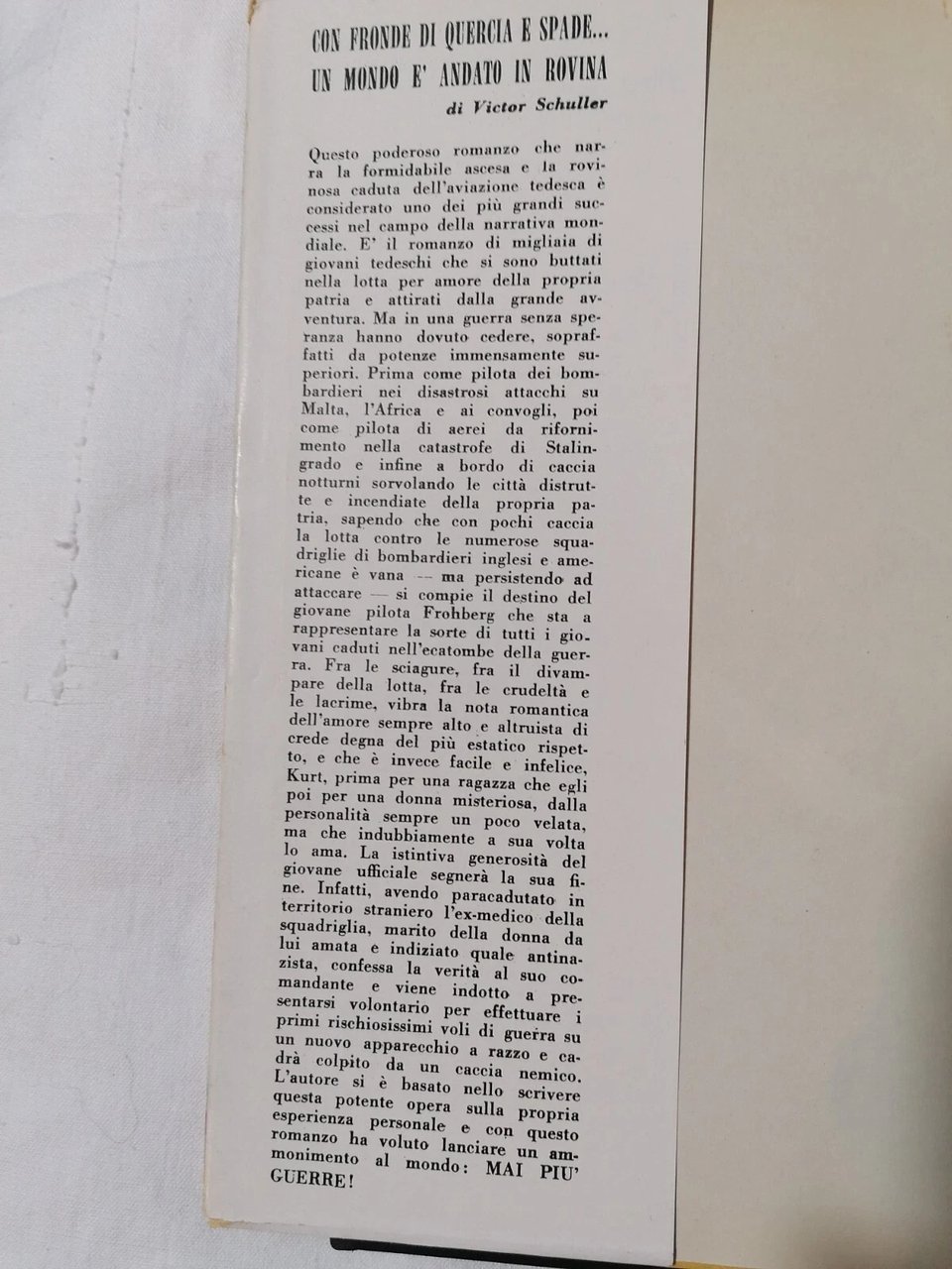 Baldini & Castoldi, 1959Collana I libri d'oro Rilegato, in 8vo, romanzo di guerra sull'aviazione tedescaCondizioni: discrete (imbrunimento dell'età)1H-6-1
