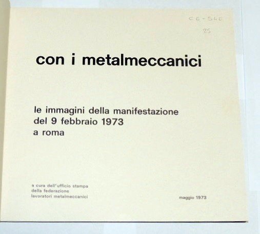 Con i metalmeccanici. Le immagini della manifestazione del 9 febbraio 1973 a Roma, a cura dell'Ufficio stampa della Federazione Lavoratori Metalmeccanici, s.l. (ma stampato a Ciampino-Roma, presso lo Stabilimento grafico editoriale Fratelli Spada) 1973, pp. 155, interamente ill. b.n., cm 19x21, br. ed. Un segno di piegatura ad un angolo della copertina posteriore, ma per il resto esemplare in buono stato di conservazione.
