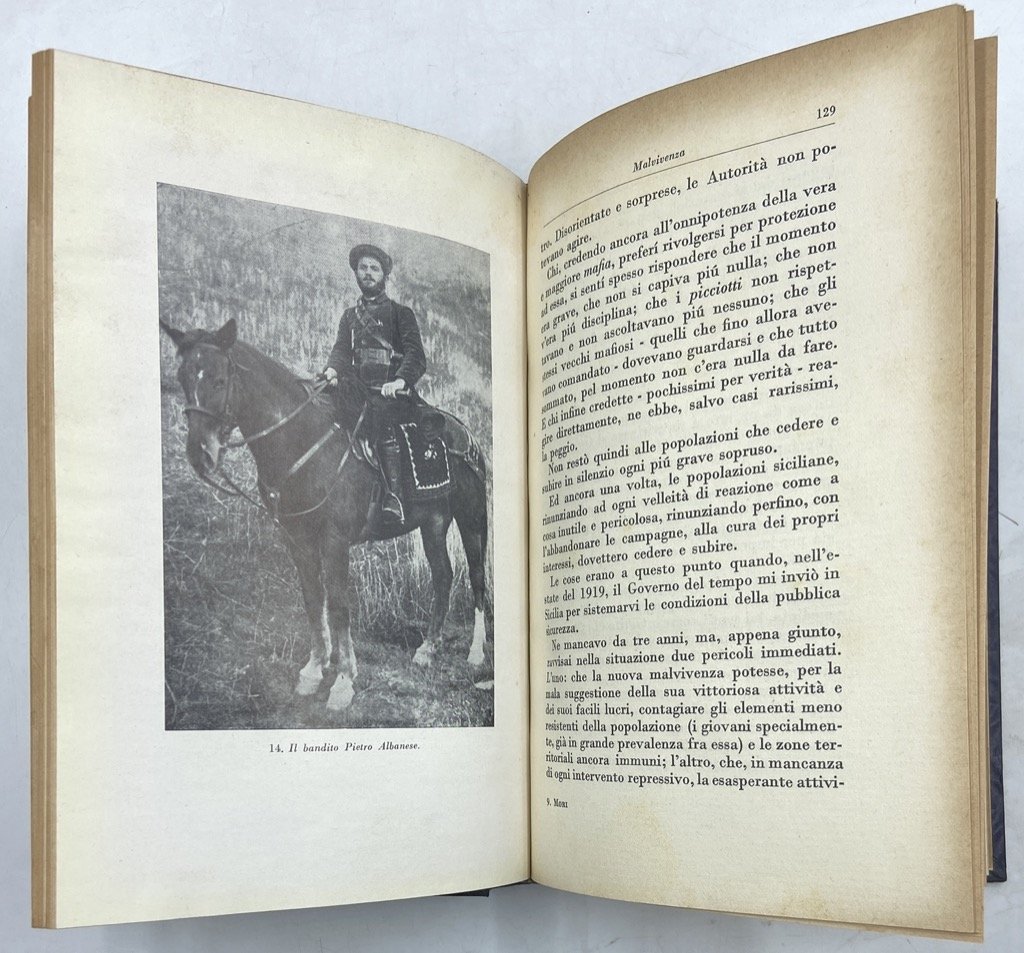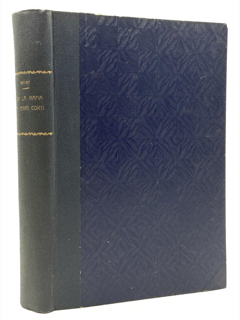 Legatura coeva in mezza tela con titoli dorati sul dorso e piatti rivestiti in carta a riquadri goffrati, in ottavo cm 22 x 14, pp 378 (2), 35 illustrazioni in nero fuori testo. Buon esemplare in legatura non editoriale, con ordinaria brunitura delle carte e lievi segni del tempo. Prima edizione. Memoriale di Cesare Mori, dal 1924 al 1929 prefetto a Trapani e Palermo impegnato in una durissima repressione della mafia con migliaia di arresti ed episodi celebri quali l’assedio di Gangi. Mori, non particolarmente gradito a Mussolini, fu messo a riposo nel 1929 e la battaglia del regime contro la mafia dichiarata conclusa e vinta, nonostante le proteste del «prefetto di ferro». Nel 1932 Mori raccontò la sua esperienza siciliana in questa memoria, che «fu osteggiata da ambienti fascisti e, nonostante una traduzione inglese e molte recensioni all’estero, in Italia fu un insuccesso editoriale» (Pezzino, DBI).