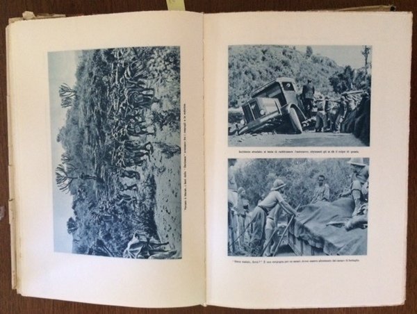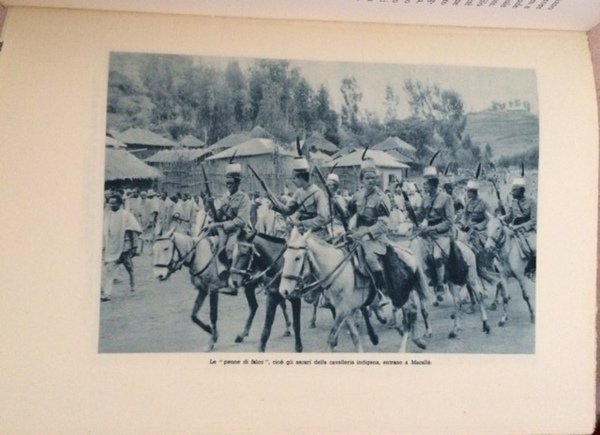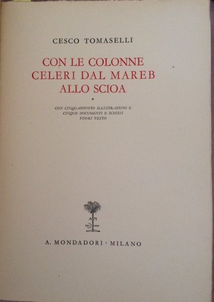 In 4° (25,3x18 cm); 266, (6) pp. e 45 c. di tav. fuori testo, alcune anche più volte ripiegate per un totole di 58 foto, 5 documenti e schizzi (2 ripiegati). Brossura editoriale con sopraccoperta editoriale illustrata da Cisari. Qualche piccolo strappetto ma senza perdita di carta e nel complesso in buone condizioni di conservazione. Prima edizione, non comune a trovarsi completa della brossur editoriale, di questa relazione del noto giornalista, scrittore ed inviato speciale del Corriere della Sera, Francesco Ugo Tomaselli, detto Cesco (Venezia, 14 gennaio 1893 Milano, 12 novembre 1963). Sua la celebre corrispondenza che seguì le tragiche vicende del dirigibile Italia comandato da Nobile. l'opera cescrive la Campagna d'Etiopia al seguito dell'Esercito Italiano descrivendo luoghi, avvenimenti, usi e costumi della popolazione locale incontrati durante la spedizione bellica. Prima edizione.