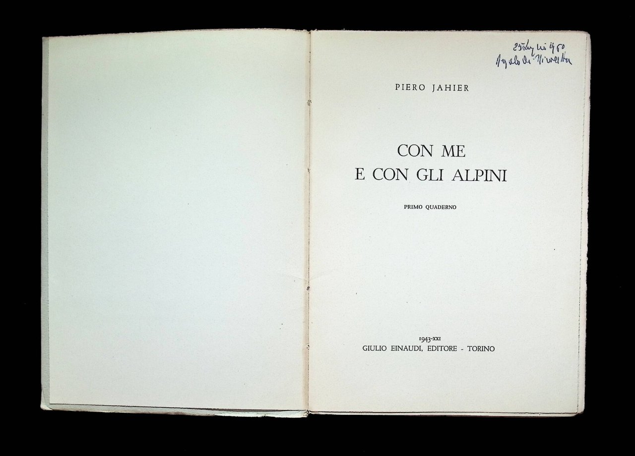 Jahier, Piero, Con me e con gli alpini Torino Einaudi 1943 8^, cm 22, pp. 176, brossura editoriale: Uno dei pochi libri che trasformarono in poesia l'esperienza etica della guerra. Prima edizione EinaudiBuono stato di conservazione, solo una firma a penna 3B-10-6 La raccolta di componimenti in versi e in prosa di Piero Jahier nasce dall'esperienza dell'autore come tenente istruttore di un reparto di alpini durante il Primo conflitto mondiale. È un diario di guerra scritto al fronte, tra il marzo del 1916 e il luglio del 1917, ma è anche un diario di vita e di valori indelebili e un unicum dal punto di vista letterario, che alterna squarci lirici e poetici a momenti narrativi. È un racconto di incontri e complicità fra reclute, di fratellanza tra quegli alpini in cui Jahier ritrova i valori in cui si rispecchia: la vita degli umili, la ricerca di purezza e verità, l'amore per la montagna. Per questo chi legge il suo diario di guerra è con lui e con gli alpini.