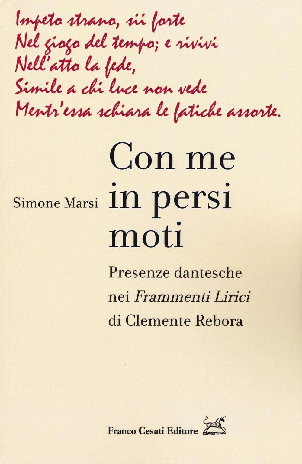In un contesto letterario finalmente più sensibile a valorizzare secondo i suoi alti meriti l'operato di un poeta come Clemente Rebora, lo studio di Simone Marsi rileva e discute la fitta presenza di occorrenze dantesche rilevabile nei "Frammenti lirici". Autore di indole complessa e acuta sensibilità, fin dalla sua prima raccolta Rebora guarda a Dante come a un sicuro, fondamentale e ineludibile punto di riferimento in senso artistico e spirituale, facendo della frequentazione della "Commedia" e delle "Rime" un'esperienza viva, a lui singolarmente consentanea ed essenziale al farsi della sua opera in versi. L'analisi di Marsi rivela come tale influenza non sia riconducibile a mere riprese vocabolaristiche o esibitamente citazionali, ma si manifesti in altri importanti ambiti della realizzazione linguistico-metaforica del testo: dalla modulazione dell'elemento fonico all'opposizione luce/ombra, dall'utilizzo dell'invettiva alla puntuale convergenza di immagini in snodi di pensiero a sfondo filosofico particolarmente densi. L'enucleazione delle fonti dantesche, lungi dal risolversi in un vacuo esercizio formale, aiuta così il lettore nella comprensione e nel pieno apprezzamento dei "Frammenti lirici".