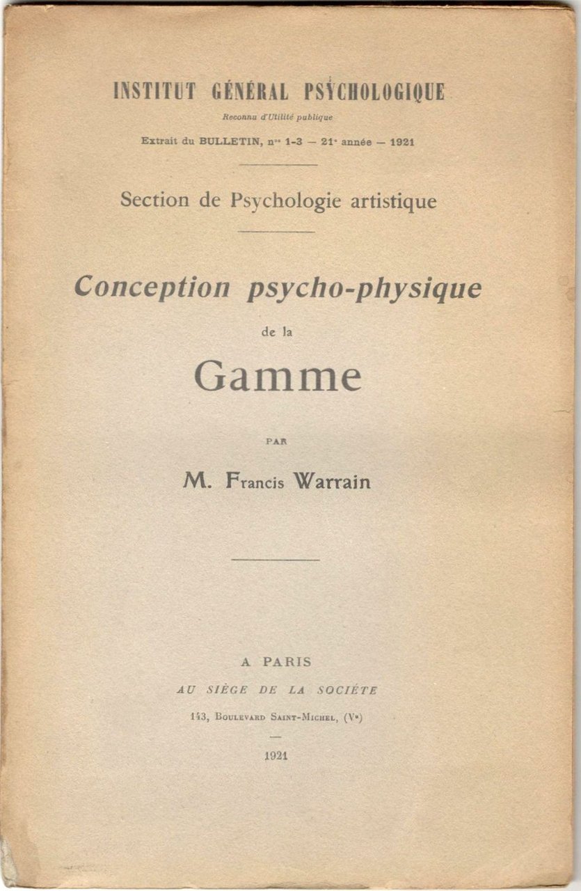 In 8°, pp. 90. Brossura editoriale. Qualche leggera traccia d'uso e un piccolo alone al margine superiore. Ingiallitura uniforme. Copia in buono stato, interamente a fogli chiusi. Prima edizione. Institut général psychologique. Extrait du bulletin n. 1-3, 21e année, 1921.