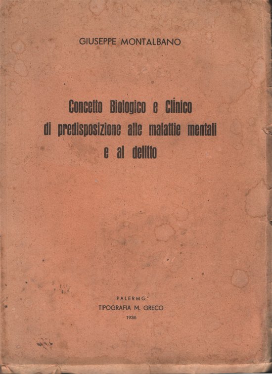 In-8°, pp. 279, (1), copertina editoriale con alcune tracce d'uso e del tempo (strappetti lungo i bordi, piccoli aloni d'umido, vedi foto). Firma d'appartenenza all'occhietto. Quasi completamente intonso. Buon esemplare di opera non comune. Parte prima. Concetto biologico e clinico di predisposizione alle malattie mentali. Premesse; Cap. I. Il principio di causalità. § 1. Esame dei diversi concetti di causalità; § 2. Applicazione in patologia mentale del prinicipio di causalità nel senso scientifico; § 3. Erroneità della dottrina circa l'identità della causa e dell'effetto. Cap. II. Il concetto di malattia mentale. § 4. Le dottrine vitalistiche in psicologia; § 5. Rapporti tra fenomeni somatici e psichici; § 6. Il concetto di malattia mentale; § 7. Critica alle diverse teorie sulle malattie mentali. Cap. III. La costituzione e suo moderno concetto. § 8. Brevi cenni introduttivi; § 9. Esame dei caratteri indicati dalla parola costituzione; § 10. Esami dei rapporti tra morfologia e funzione e tra morfologia e psiche; § 11. I fattori della costituzione; § 12. Definizione della costituzione e sua principale caratteristica; § 13. Costituzione anomala e sua fondamentale caratteristica; § 14. Il concetto di "costituzione morbosa" e di "malattia costituzionale". Cap. IV. La predisposizione alle malattie mentali. § 15. Brevi cenni introduttivi; § 16. il concetto biologico e clinico di predisposizione alle malattie fisiche; § 17. Concetto biologico e clinico di predisposizione alle malattie mentali; § 18. Quali sono i caratteri clinici che fanno riconoscere coloro i quali sono predisposti alle malattie mentali. Conclusione della prima parte. Parte seconda. Concetto biologico e clinico di predisposizione al delitto. Cap. I. Causalità e psicogenesi delle azioni delittuose. § 1. Considerazioni preliminari; § 2. Identità ontologica tra azioni criminali e azioni immorali; § 3. Universalità del delitto; § 4. Causalità del delitto; § 5. Genesi del delitto. Cap. II. La predisposizione al delitto. § 6. Brevi cenni introduttivi; § 7. Costituzione. temperamento carattere; § 8. Concetto biologico e clinico di predisposizione al delitto; § 9. I due tipi fondamentali d'individui con predisposizione al delitto. Conclusione della seconda parte. Postilla I. Postilla II. Postilla III.