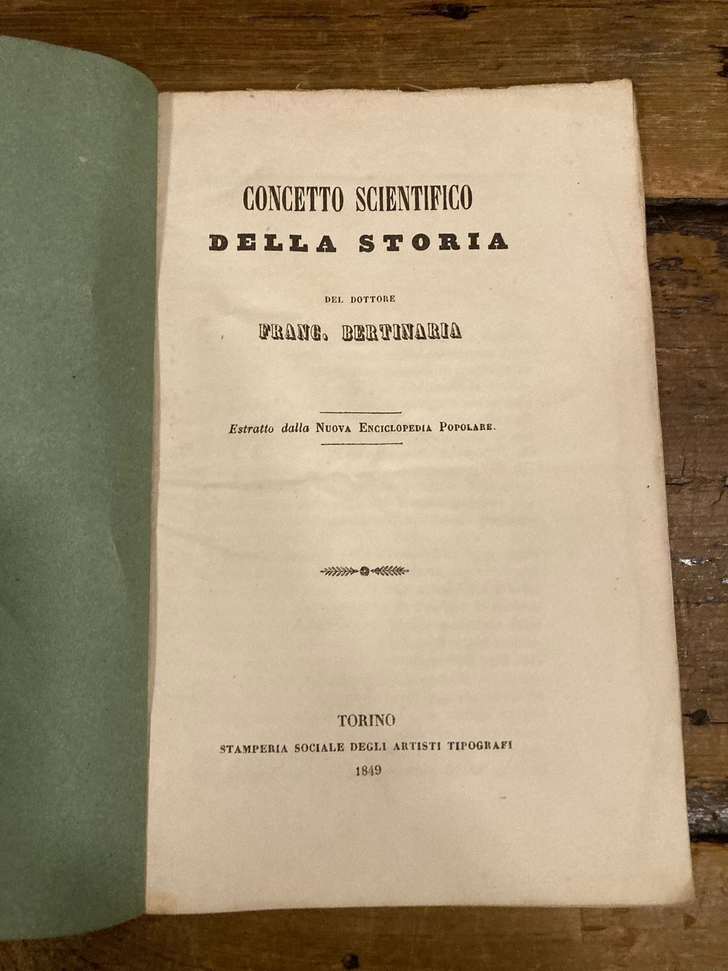 In-16° (18x11cm), pp. 24, brossura muta d'attesa verde. Fregio tipografico al frontespizio. Più che buoo esemplare. Non comune memoria sotto forma di estratto scritta dal filosofo ligure F. Bertinaria (1816-1892) trasferitosi a Torino. L'opuscolo è anche testimonianza dell' attività tipografica della Stamperia Sociale Torinese.