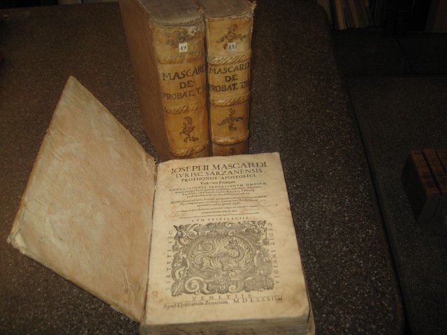 3 voll. in-folio (350x230mm), ff. (94) di indice, 432; 451, (83) di indice; (94) di indice, 432; legatura settecentesca p. pergamena rigida con titolo manoscritto in antico su dorsi a nervi. Imprese tipografiche ai frontespizi incise su legno con la salamandra coronata avvolta dalle fiamme entro cornice istoriata con putti, grottesche e festoni. Testo bicolonne. Dedicatoria a Gregorio XIII, fregi tipografici in xilografia. Antiche firme di possesso ai frontespizi. Sparse gore e lavori di tarlo, quasi mai toccanti lettere di testo. Qualche occasionale glossa marginale antica. Al primo vol., manca l'angolo della c. I2 di indice, restauri alle cc. 5-6. Sguardie rinforzate in antico al secondo e al terzo vol.; allo stesso vol., manca l'angolo della c. F2 dell'indice. Discreto esemplare. Prima edizione in raccolta, rara a reperirsi completa, delle opere giuridiche del Mascardi. Il Mascardi, nato a Sarzana in data imprecisata e deceduto nel 1588, fu giureconsulto e protonotario apostolico, nonché vescovo di Ajaccio nel 1585. Fu fratello di Niccolò Mascardi. Così Emanuele Gerini, nelle sue Memorie storiche d'illustri scrittori e di uomini insigni dell'antica e moderna Lunigiana (I p. 108) tratteggia la figura del Mascardi: 'Giuseppe, da prima fu protonotaro apostolico e visse alla corte di Urbino, e poscia vicario fu di San Carlo Borromeo di Milano, andò a Roma, e colà ebbe l'uffizio di referendario del papa, indi quello di visitatore apostolico del regno di Corsica, e della diocesi di Pavia. E perche' poi appresso il vescovo di Piacenza Filippo Saga dove' andare a nunzio nelle Spagne, questo Mascardi fu posto a reggere quella chiesa. In si' nobile uffizio tanta prudenza mostro' egli che 'l pontefice Sisto V nel 1585 creollo vescovo in Corsica, ed ebbesi inoltre la nunziatura della Lorena. Finalmente di quel paese tornando nel passar per Sarzana abbattuto dalla vecchiezza nel 1586 fra le lagrime de suoi fu dalla morte colpito, e lascio' al mondo nome venerabile si' per le sue virtudi come per i libri apprezzatissimi che diede a luce di materie legali'. Adams, M-833 (solo primo vol.). Manca a STC Italian.