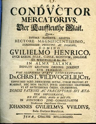 Conductor Mercatorius. Der Kauffleuthe Glait. Quem Divina favente Gratia Rectore Magnificentissimo. Guilielmo Henrico. sub praesidio. Christ. Wildvogelii.die XIV April. anno MDCCVII in Auditorio Jure Consultorum Eruditorum disquisitioni submittit