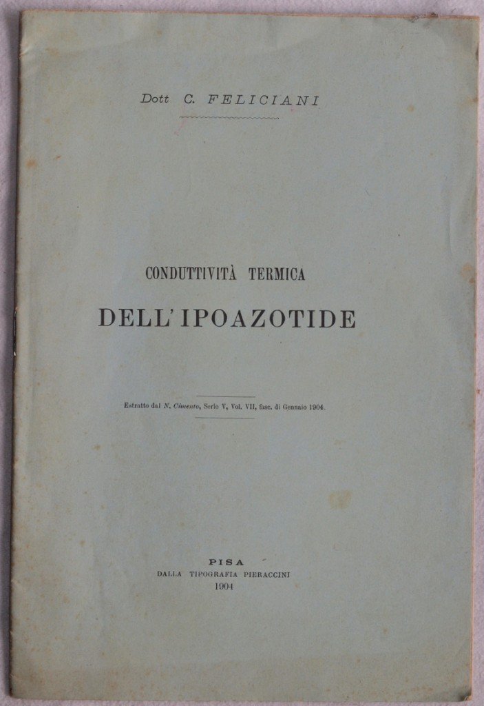 In 8. Dim. 25x16,5 cm. Pp. 20. Rara pubblicazione del 1904 sulla conduttività termica dell'ipoazotide del Dott. Feliciani. Estratto dal N. Cimento, serie V, vol. VII, fasc. di Gennaio 1904 All'interno qualche figura. Dedica manoscritta dell'autore con firma. In ottime condizioni. Brossura editoriale in ottime condizioni generali con lievi usure ai margini e dorso. Legatura in buone condizioni. All'interno le pagine si presentano in ottime condizioni con rare fioriture. Scarce pamphlet of 1904 about thermic conduction of nitrogen tetroxyde by Dott. Feliciani Extract from N. Cimento, series V, vol. VII, fasc. of January 1904. Some illustration inside. Manuscripted dedication of the author with signature. In very good conditions. Editorial cover in very good general conditions slightly worn in the edges and spine. Binding in good conditions. Inside pages are in very good conditions with occasional foxings.
