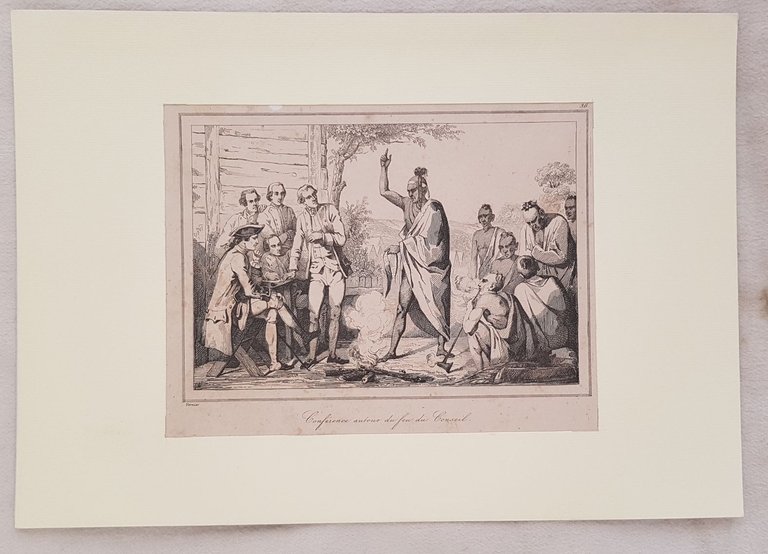 Veduta animata del 1838 circa che mostra indiani nativi mentre parlano intorno a un fuoco montata in passepartout. Data: 1838 circa Tecnica: acquaforte Dimensione foglio: 17,5x25 cm Dimensione incisione: 11,5x15 cm Condizioni: Buone. Rare fioriture.Nice view of Native Indians talking around a fire of 1838 circa mounted in a passepartout. Date: 1838 circa Technique: Steel etching Passepartout Dimension: 17,5x25 cm (6.9x9.8 inches) Engraving Dimension: 11,5x15 cm (4.5x5.9 inches) Conditions: Good conditions. Some foxings.
