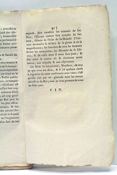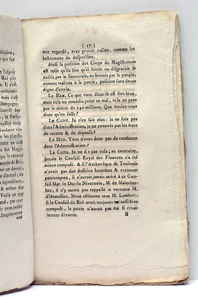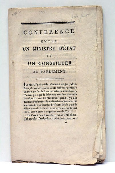 in-8. 47pp. Broché. Non rogné et non coupé. Feuillets un peu écornés. Entretien fictif où les représentants de la cour et de la magistrature débatent à propos des impôts, de Necker, de la justice, etc.