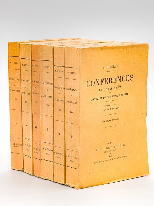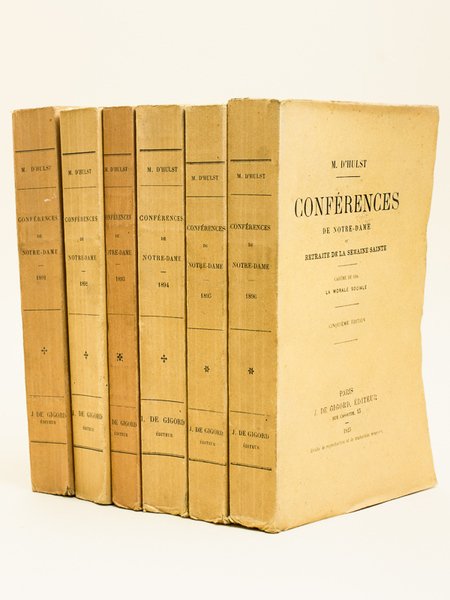 Quatrième et cinquième édition, 6 vol. in-8 br., Ancienne Librairie Poussielgue, J. de Gigord, Paris, 1914-1925. [ Contient : ] Carême de 1891 : Les Fondements de la moralité ; Carême de 1892 : Les Devoirs envers Dieu (1er commandement) ; Carême de 1893 : Les Devoirs envers Dieu (fin) ; Carême de 1894 : La Morale de la Famille ; Carême de 1895 : La morale du Citoyen ; Les Devoirs envers Dieu (1er commandement) ; Carême de 1895 : La Morale sociale Complet. Rare ensemble bien complet, en très bon état.