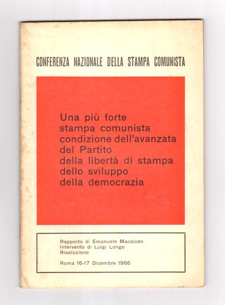 Brossura (cm 25x14) pag. 58. -- Rapporto di Emanuele Macaluso, intervento di Luigi Longo, Risoluzione. Roma, 16-17 dicembre 1966". A cura della Sezione Centrale stampa e propaganda del P.C.I.