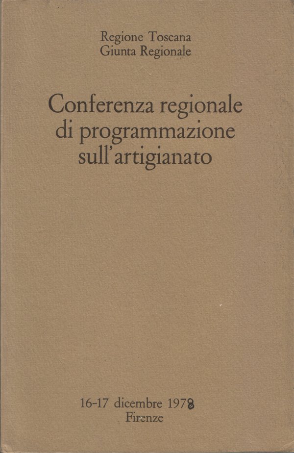 In-8°, pp. (4), 293, (3), copertina editoriale. Ben conservato. Indice: Premessa. Interventi introduttivi. Relazioni. Carletto Monni, Assetto istituzionale dell'artigianato; Luigi Tassinari, Artigianato e formazione professionale; Giorgio Pacini, Assistenza tecnica e gestionale. Comunicazioni. L'attività promozionale e il ruolo della Regione (a cura del Dipartimento Attività produttive, Turismo e Commercio); Attività produttive e territorio (a cura del Dipartimento Assetto del territorio); L'artigianato e la distribuzione delle attività economiche - produttive nello spazio (a cura del Dipartimento Attività produttive, turismo e commercio). Dibattito (Interventi di Giordano Giovannetti, Carlo Serafini, Laura Gacci, Rodolfo De Ambris, Paolo Cantelli, Marco Bettardi, Silvano Sandomini, Moreno Bucci, Luciano Arian, Vezio Cantini, Fabio Valori, Alberto Passamonti, Fulvio Bencini, Giuseppe Matulli, Fiorenzo Michelozzi, Giorgio Bertinelli, Vannuccio Broccolini, Fabrizio Fantini, Sergio Farulli, Enzo Tenti, Lido Giomi, Renzo Ciulli, Giovanni Marianini, Mauro Viaggi, Bruno Guiducci, Ferruccio Paini). Risoluzione congiunta dell'Amministrazione Provinciale, dell'Associzione Provinciale Artigianato e della Confederazione Provinciale di Massa Carrara. Documenti conclusivi delle commissioni. Tavola rotonda (Interventi di Fidia Arata, Carlo Sadun, Laura Gacci, Giorgio Bertinelli, Giorgio Pacini, Carlo Mariani). Conclusioni. Elenco dei partecipanti alla Conferenza Regionale di Programmazione sull'Artigianato; Elenco dei componenti le Commissioni di Lavoro insediate durante lo svolgimento dei lavori.