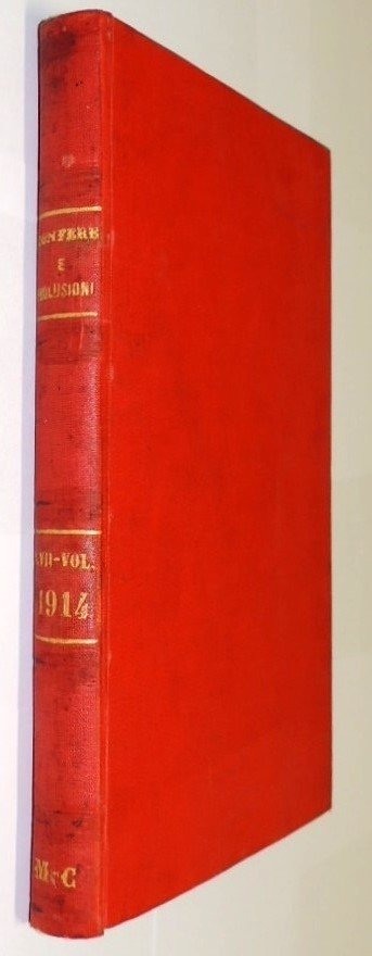 Conferenze e prolusioni. Periodico quindicinale, Unione Tipografico-Editrice Torinese, s.l. (ma stampato a Roma, presso la Stamperia Reale D. Ripamonti), anno VII (1914), annata completa di 24 numeri rilegata, pp. XII, 484, ill. b.n., cm 28, legatura in tutta tela con titoli e fregi in oro al dorso. Segni del tempo, per il resto volume ben conservato, completo di frontespizio originale dell'annata.