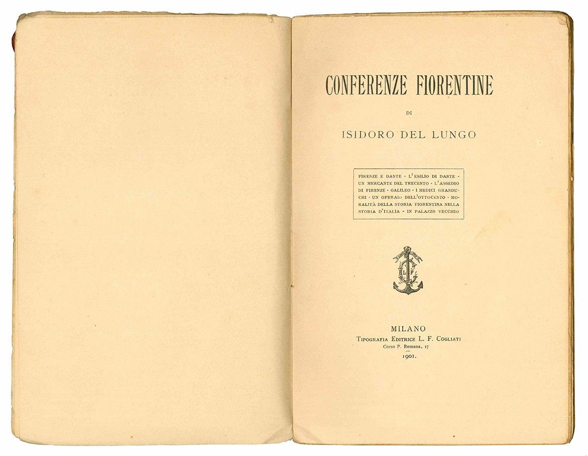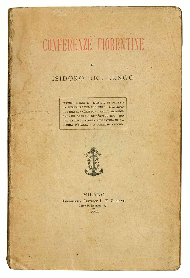 In 8vo (mm 233x152); pp. X, 298, [2]. Copertina editoriale con piccole mancanze marginali e al dorso, piccole macchioline ai piatti. Prima edizione di questa interessante raccolta di dieci conferenze su Dante, Galileo, Datini, i Medici, ecc.