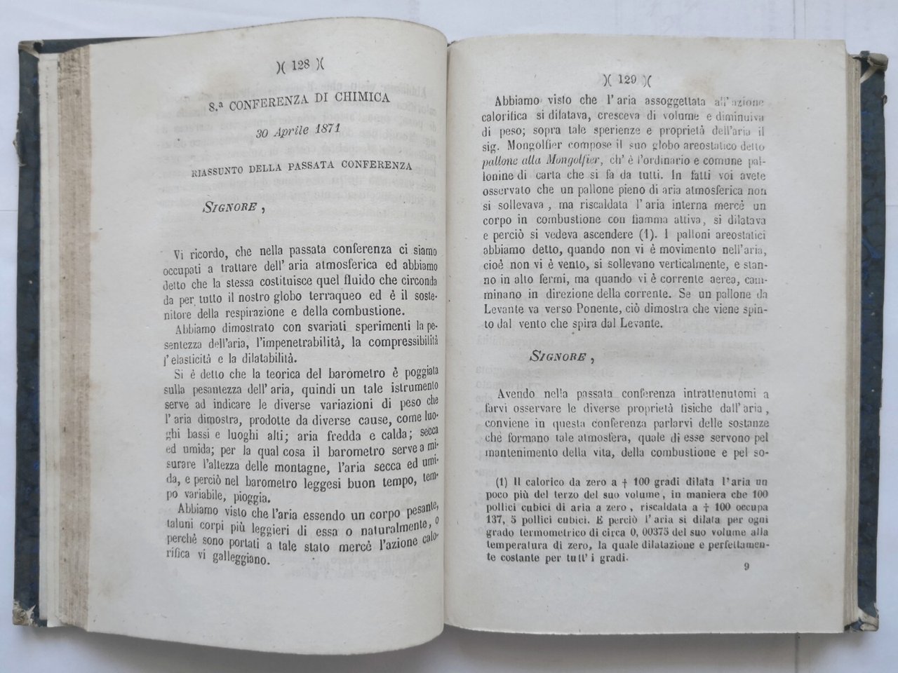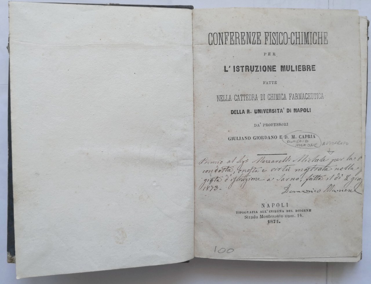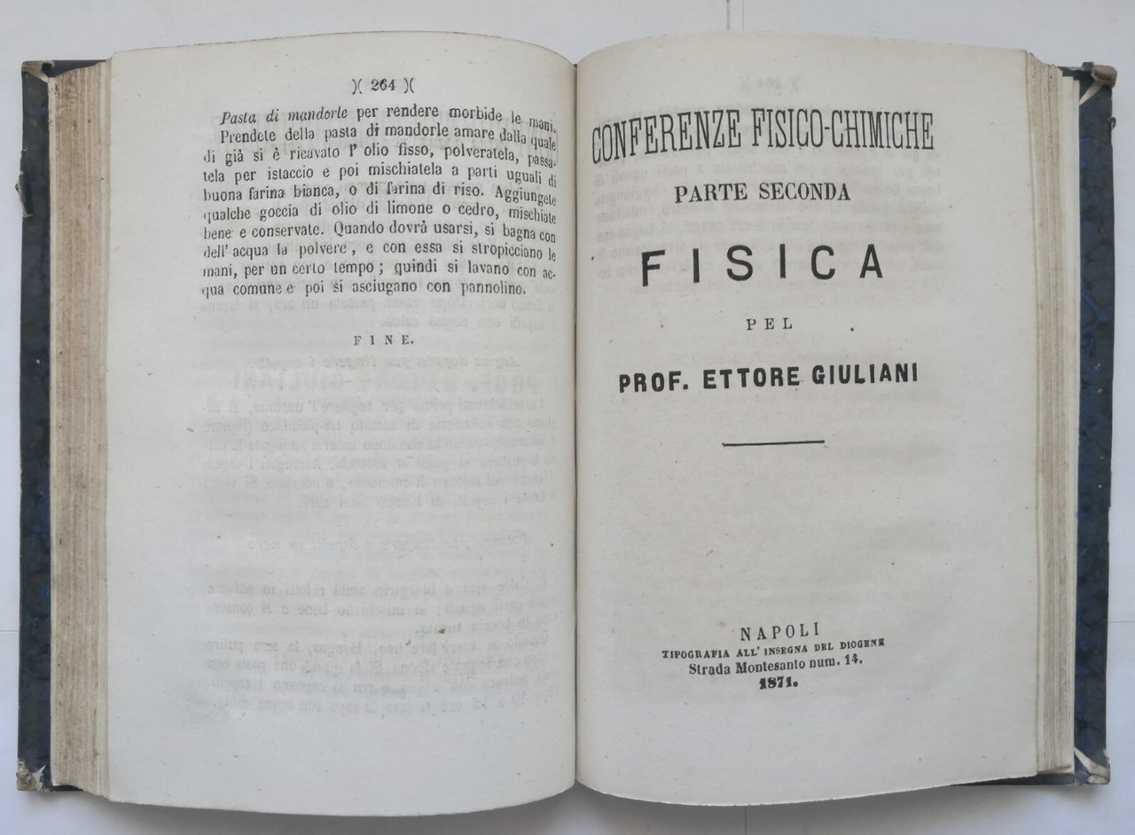 CONFERENZE FISICO CHIMICHE PER L'ISTRUZIONE MULIEBRE fatte nella cattedra di chimica farmaceutica della R. Università di Napoli da'professori Giuliano Giordano e Domenico Mamone Capria + CONFERENZE FISICO CHIMICHE parte seconda: FISICA di Ettore Giuliani. Due volumi rilegati insieme.