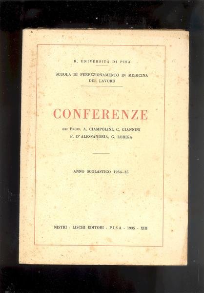 IN 8° ( cm.25 X 18 ), pp.133 + INDICE, COPERTINA EDITORIALE CON TITOLO ENTRO CORNICE.<BR>SONO LE CONFERENZE DELLA SCUOLA DI PREFEZIONAMENTO IN MEDICINA DEL LAVORO<BR>DELLA R. UNIVERSITA' DI PISA, PER L'ANNO SCOLASTICO 1934 - 35.<BR>ALCUNI STRAPPETTI SPARSI NEL TAGLIO DI TESTA, DUE MACCHIETTE NELLA SECONDA<BR>DI COPERTINA, ALTRIMENTI BUON ESEMPLARE.ID 1515