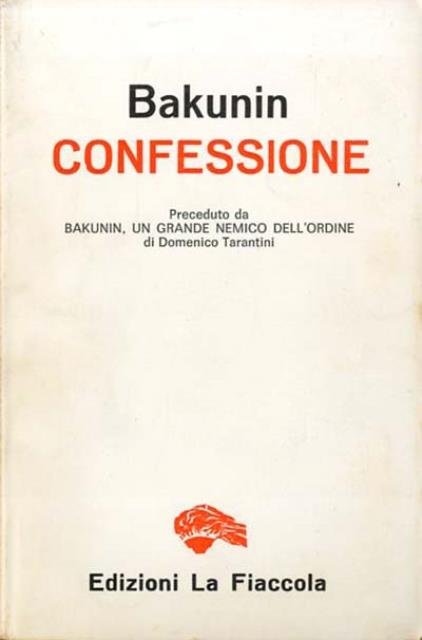 174 p. ; 21 x 14 cm. Biblioteca delle collane «Anteo» e «La Rivolta», 18. La confessione di Bakunin allo zar Nicola I fu pubblicata a Mosca nel 1921 e undici anni dopo venne tradotta in francese e pubblicata a Parigi. Bakunin scrisse questo documento nella fortezza di Pietro e Paolo a Pietroburgo nel 1851 per invito di Nicola I e con la speranza di ottenere una mitigazione della pena, magari la deportazione in Siberia. Lo zar, lette queste pagine, scrisse in margine, di suo pugno: «Non vedo per lui nessun'altra soluzione che la deportazione in Siberia». Ma lo lasciò in galera: Bakunin rimase nella fortezza di Pietro e Paolo dal maggio 1851 al marzo 1854, quando fu trasferito nel carcere di Schlüsserburg, dove rimase fino al 1857. Successivamente, dopo la morte di Nicola I, Bakunin venne deportato in Siberia da dove nel 1861 riuscì a fuggire. Il testo è preceduto dal saggio: «Bakunin, un grande nemico dell'ordine», di Domenico Tarantini. Brossura editoriale, coperta in cartoncino rigido con titolo impresso a colori (nero e rosso) al piatto e al dorso. Codice libreria 9111.