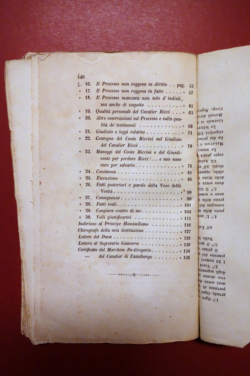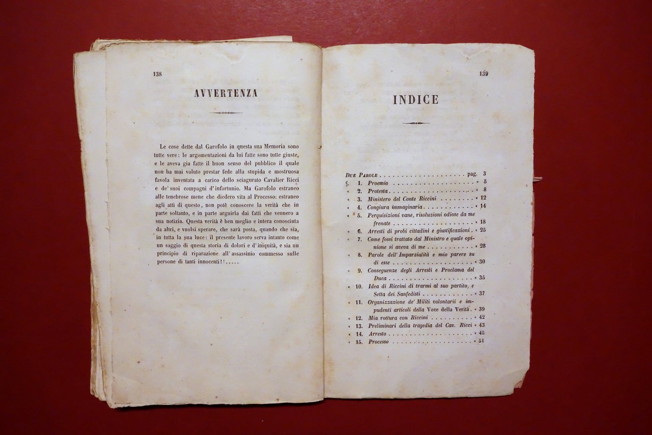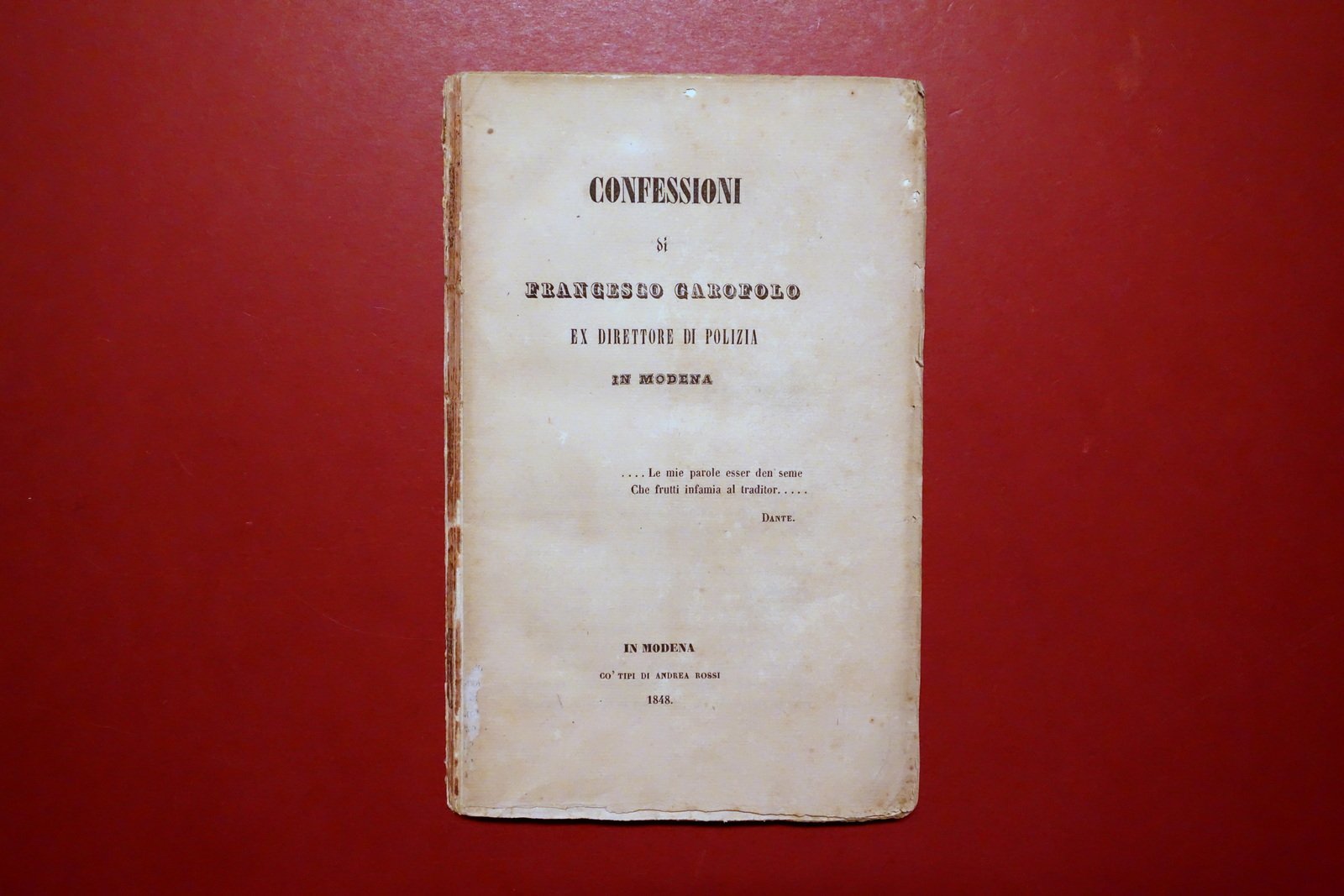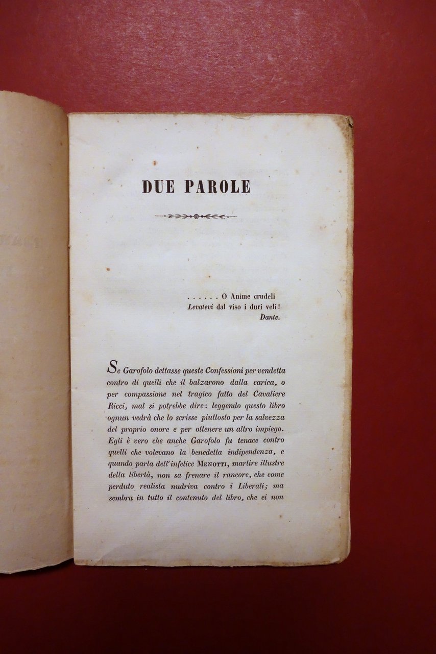 Confessioni di Francesco Garofalo ex direttore di polizia in Modena Co'Tipi di Andrea Rossi, Modena 1848; cm 21,5x13,5; pp. 140; interni marginosi con barbe. Mancanza della brossura anteriore e di parte del dorso (vedi foto). Condizioni di conservazione Condizioni discrete con tracce d'uso e leggeri segni del tempo, mancanza della brossura ant. d'attesa, al dorso alcune piccole mancanze e qualche fessurazione con conseguente leggero allentamento delle cuciture (vedi foto); margini del frontespizio e della brossura post. con pochi minuscoli strappetti e mancanze. Alcune minime leggerissime bruniture. Prima nonché unica edizione, raro. L'autore, di origine partenopea, diresse la polizia" modenese dal 1831 al 1832, durante il governo del Duca Francesco IV. Da rilegare. OPEB.5642 N "