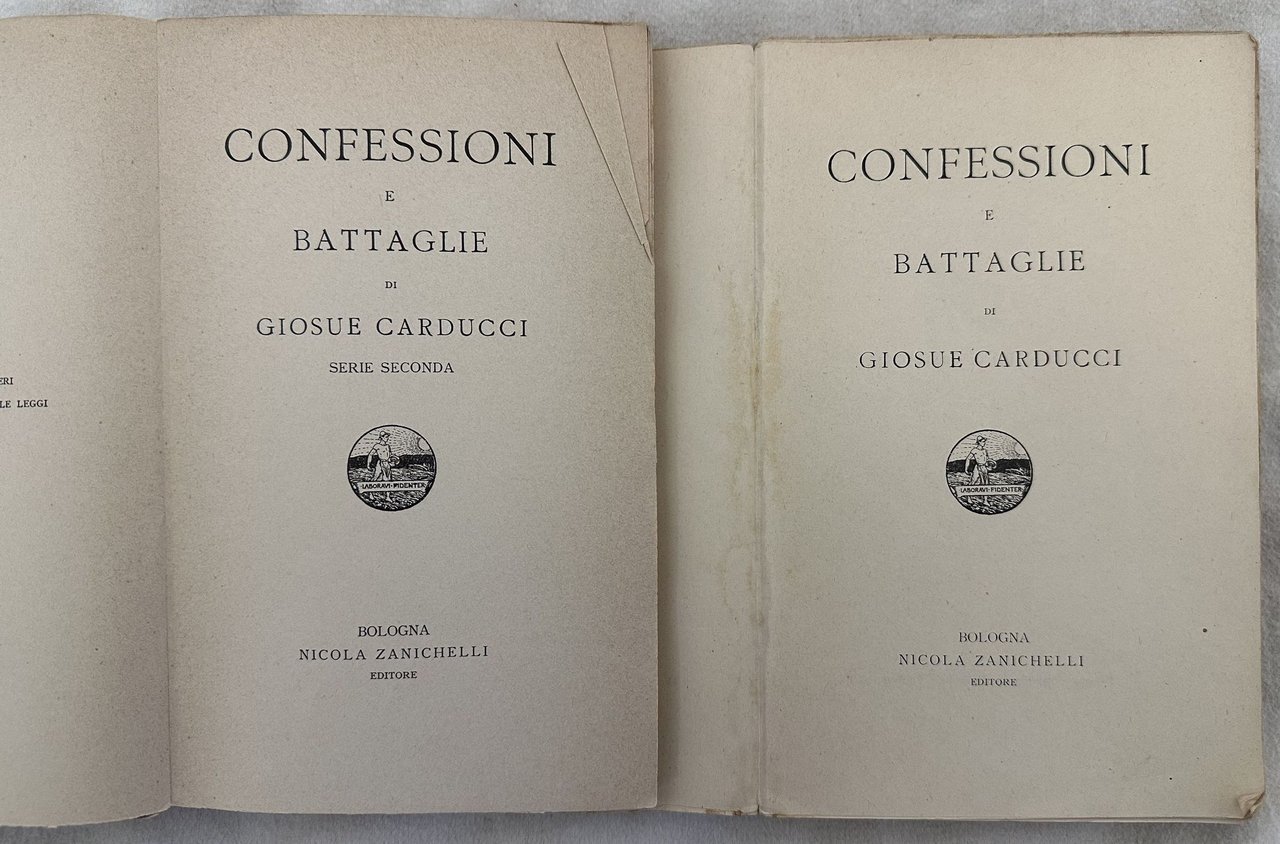 Edizione del 1885 dell'opera "Confessioni e battaglie" del poeta e scrittore Giosuè Carducci (1835-1907). Copertina editoriale originale.<BR>In buone condizioni. Copertina editoriale in buone condizioni generali con lievi usure marginali. Legatura in discrete condizioni con lievi rotture. Pagine in buone condizioni con rare fioriture. In 8. cm 20x12,5. Pp. 484+488. Edition of 1885 of the work "Confessioni e battaglie" byt he writer and poet Giosuè Carducci (1835-1907). Editorial cover. In good conditions. Editorial cover in good conditions lightly worn in the extremities. Binding in fair conditions with light cracks. Pages in good conditions with occasional foxing. In 8. cm 20x12,5. Pp. 484+488.
