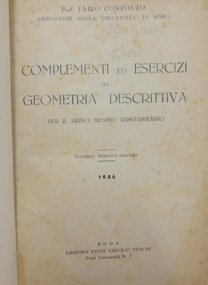 Fabio Conforto, Complementi ed esercizi di geometria  per il biennio universitario, Libreria Eredi Virgilio Veschi, Roma 1946, pp. 352, ill. b.n., cm 25, legatura in tutta tela rossa con titoli al dorso. Manoscritto ciclostilato. Firma d’appartenenza al frontespizio. Qualche leggera sottolineatura a lapis e pastello, piccoli restauri al margine del frontespizio e su tre carte interne, fioriture, lieve brunitura della carta, ma nel complesso copia ben conservata.