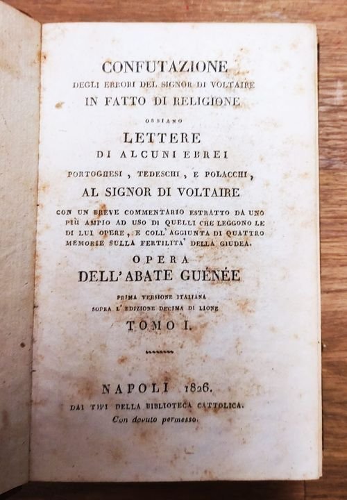 Confutazione degli errori del signor di Voltaire in fatto di religione ossiano Lettere di alcuni ebrei portoghesi, tedeschi, e polacchi, al signor di Voltaire con un Breve commentario estratto da uno piu ampio ad uso di quelli che leggono le di lui opere, e coll'aggiunta di quattro memorie sulla fertilita della Giudea. Opera dell'abate Guenee. Tomo 1.-7.