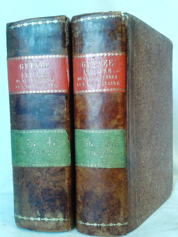 Opera in 6 tomi in 3 tre volumi (I PRIMI DUE TOMI MANCANTI) in 8 legati in mezza pelle, titolo al tassello ai dorsi, tagli marezzati, sguardie, frontespizi, 366, 358 pp., colophon, 293, 268 pp., 12 cc. di elenco, bianche finali. Importante opera di confutazione scritta dall'abate Gune sul riconosciuto antisemitismo di Voltaire, tratta nel secondo volume l'esistenza di Abramo e di Mos, le leggi sui sacrifici, la circoncisione, le profezie e le leggi Mosaiche religiose e morali. L'ultimo volume descrive le leggi civili politiche e militari. In finale alcune ricerche intorno alla Giudea considerata principalmente per rapporto alla fertilit del suo territorio, dalla cattivit di Babilonia sino ai giorni attuali. Lievi mende d'uso e piccole mancanze alle legature. In ottimo stato, interessante, di scarsa reperibilit. Siamo sempre interessati all'acquisto dei tomi mancanti.