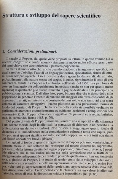 Il saggio di Popper, del quale viene proposta la lettura in questo volume («La scienza: congetture e confutazioni») riassume in modo molto efficace gran parte dei temi-chiave che caratterizzano il pensiero popperiano. Si tratta di uno scritto che, anche quando si addentra in argomenti specifici, nei quali sarebbe d'obbligo l'uso di un linguaggio tecnico, specialistico, risulta di lettura quasi sempre agevole. Ciò è dovuto a due ragioni fondamentali: da un lato, probabilmente, alla natura stessa del saggio, il quale, riproducendo il testo di una conferenza tenuta da Popper a Cambridge nell'estate del 1953, usa per forza di cose un linguaggio più colloquialmente immediato (anche se non per questo meno rigoroso) di quello che può essere utilizzato in pagine destinate sin da principio alla pubblicazione a stampa. Dall'altro lato, però, bisogna dire che è tipico dello stile popperiano in generale l'intento di puntare alla maggior chiarezza consentita dagli argomenti trattati; un intento che corrisponde non solo e non tanto ad una mera volontà di carattere divulgativo, quanto piuttosto ad una persuasione teorica di fondo del pensiero di Popper: che la ricerca della verità sia possibile «soltanto se parliamo chiaramente e semplicemente ed evitiamo tecnicismi e complicazioni non necessari» (K. R. Popper, Conoscenza oggettiva).