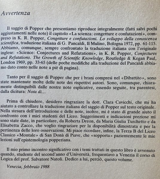 Il saggio di Popper che presentiamo riproduce integralmente (fatti salvi pochi aggiustamenti nelle note) il capitolo «La scienza: congetture e confutazioni», compreso in K. R. Popper, Congetture e confutazioni. Lo sviluppo della conoscenza scientifica, traduzione italiana di G. Pancaldi, Il Mulino, Bologna 1972, pp. 61-115. Abbiamo, comunque, sempre confrontato la traduzione italiana con l'originale inglese: «Science: Conjectures and Refutations», in K. R. Popper, Conjectures and Refutations. The Growth of Scientific Knowledge, Routledge & Kegan Paul, London 1969, pp. 33-65 (delle poche modifiche alla traduzione del Pancaldi abbiamo dato conto nelle note a piè di pagina). Tanto per il saggio di Popper che per i brani compresi nel «Dibattito», sono state mantenute molte delle note dei rispettivi autori. Sono, comunque, chiaramente distinguibili dalle nostre note esplicative, essendo seguite, tra parentesi, dalla dicitura: Nota di.