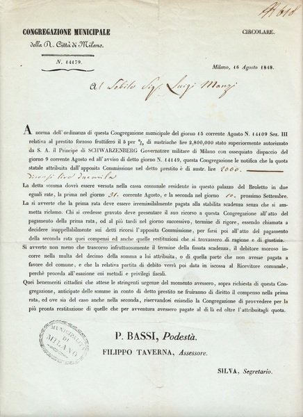 Congregazione municipale della R. Città di Milano. Circolare n. 24179 del 16 Agosto 1848. Sottoscrizione al prestito forzoso fruttifero del Sig. Luigi Manzi autorizzato dal Principe di Schwarzenberg, da P. Bassi. Filippo Taverna e Silva.