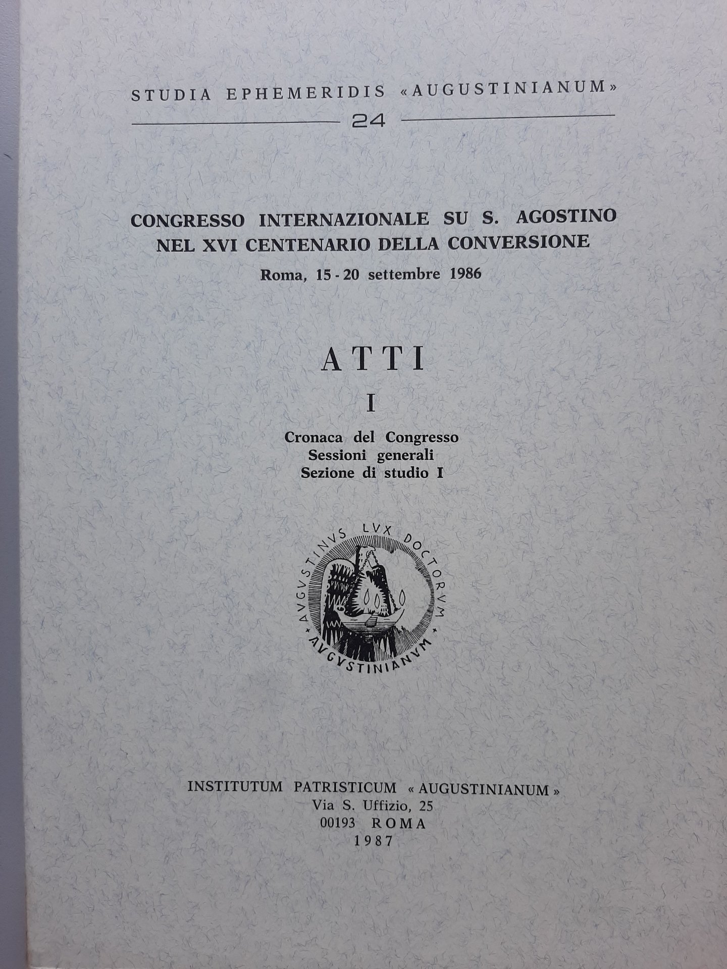 Congresso internazionale su S. Agostino nel XVI centenario della conversione. Roma, 15-20 Settembre 1986. Atti I. Cronaca del Congresso. Sessioni Generali. Sezione di studio 1°.