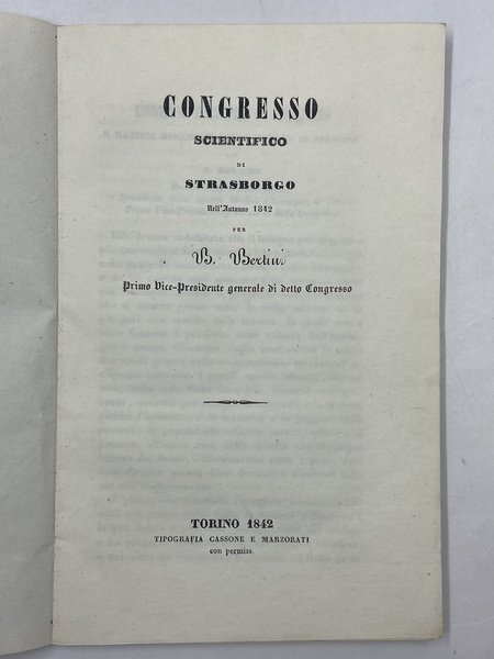 CONGRESSO SCIENTIFICO DI STRASBORGO dell’Autunno 1842 per B. Bertini Primo Vice-Presidente generale di detto Congresso.