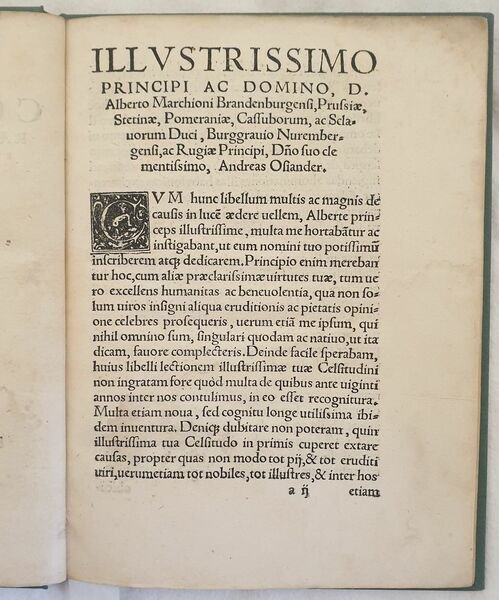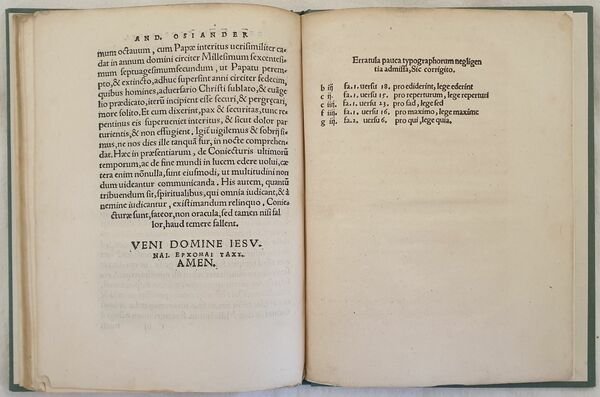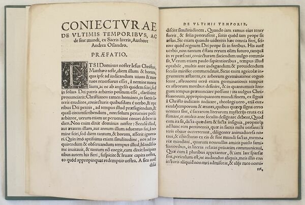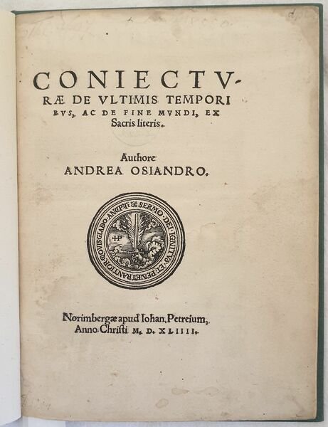 Prima edizione del 1544 di questo breve trattato del teologo e riformatore Andreas Osiander (1496-1552). L'opera è un breve studio sulla fine del mondo, il giudizio universale e l'Anticristo da un punto di vista Protestante. In questo esemplare è presente anche la carta finale "Erratula poauca typographorum negligentia admissa sic corrigito" mancante nella gran parte delle edizioni successive. "Hardly had these 'Coniecturae' appeared at the end of Julius 1544 than a few days later a letter went around complaining about the insults to such holy men and threatening all sorts of things. Osiander also saw this letter himself, the author of which he learned from the knew the name and the handwriting well; and he was just amazed at the special coincidence that a writing that was mainly directed against the Antichrist, first aroused the Zwinglians against him" (Georg Andreas Will, Literary Museum II/1, 1778, a4, p. 214f.). In ottime condizioni e completo. Copertina cartonata moderna in ottime condizioni generali. Legatura in buone condizioni. All'interno le pagine si presentano in buone condizioni con fioriture. In 8. Dim. 21x16,5 cm. Pp. (70)+(1).