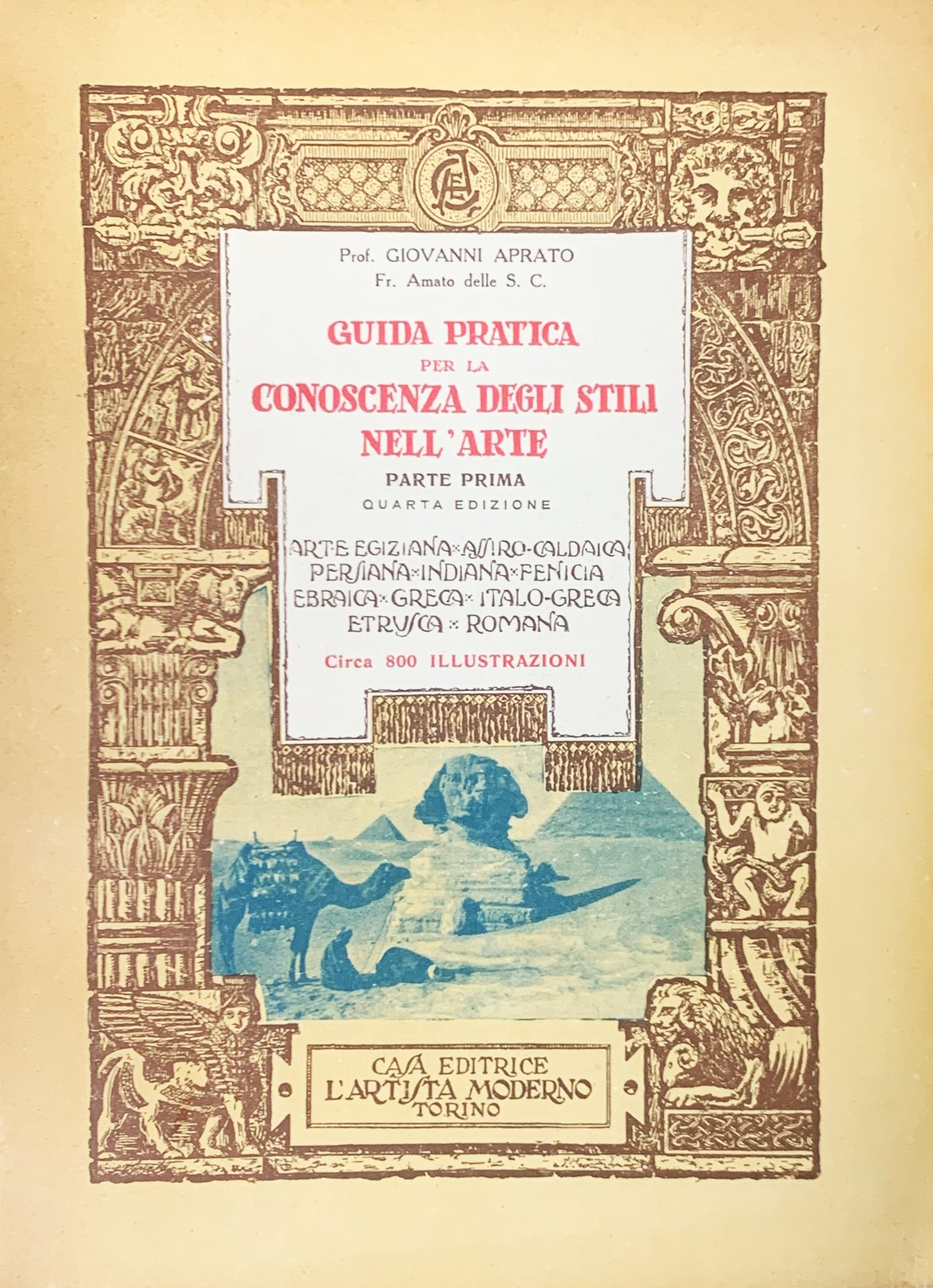 IV ed. della Parte Prima dell'opera in tre parti. In-8, pp. 344, brossura in cartoncino liscio beige esternamente e con un ornato architettonico ad arco in marrone al primo piatto che incornicia una veduta fotografica in b/n virata sui toni del blu di Menfi con un cammello e cammelliere a riposo, la sfinge di Gise e sullo sfondo le piramidi. Con ca. 800 illustrazioni (fotografie e disegni) in b/n nel testo (più di 740) e in antiporta una tavola f.t. a colori. Al termine del volume un Dizionario artistico. Stato buono (leggero stato d'uso della copertina - pagine ingiallite, in particolare ai margini). Stili trattati: Arte Orientale (Egiziana, Assiro-Caldaica, Persiana, Indiana, Fenicia, Ebraica, Asiatiche Minori) - Arte Classica (Greca, Italo-Greca (Pompeiana), Etrusca, Romana). Sommario: Prefazione, Torino, 16 febbraio 1955 - Preliminari - Divisione generale dell'Opera - Periodi dell'Arte Antica - Arte Egiziana (Generalità - Architettura - Elementi architettonici - Monumenti funerari - Ornamentazione scultoria - Ornamentazione pittorica - Scultura - Pittura - Arti minori egiziane) - Arte Assiro-Caldaica (Generalità - Architettura - Elementi architettonici - Ornamentazione scultoria - Ornamentazione pittorica - Scultura - Pittura - Arti minori) - Arte Persiana (Generalità - Architettura - Elementi architettonici - Palazzi - Tombe - Ornamentazione scultoria - Ornamentazione pittorica - Scultura - Pittura - Arti minori) - Arte Indiana (Generalità - Architettura religiosa buddistica - Architettura religiosa braminica - Architettura civile indiana - Scultura - Pittura) - Arte Fenicia (Generalità - Architettura - Ornamentazione scultoria e pittorica - Scultura - Pittura - Arti minori) - Arte Ebraica (Generalità - Architettura - Arti minori) - Popoli dell'Asia Minore (Generalità - Ioni - Ittiti) - Arte Greca (Generalità - Arte Egea - Arte Pelasgica primitiva - Arte cretese - Arte micenea - Arti minori egee - Periodo dorico (Ordine orico) - Periodo ionico o aureo (Ordine ionico) - Periodo corinzio o della decadenza (Ordine corinzio) - Elementi di ornamentazione scultoria - Elementi di ornamentazione pittorica - Edifici greci - Scultura - Pittura - Arti minori) - Arte Italo-Greca (Pompeiana (Generalità - Architettura - Ornamentazione scultoria - Ornamentazione pittorica - Arti minori) - Arte etrusca (Generalità - Architettura - Scultura - Pittura - Arti minori) - Arte Romana (Generalità - Architettura - Ornamentazione scultoria - Ornamentazione pittorica - Scultura - Pittura - Monumenti ed edifizi romani - Arti minori) - Dizionario artistico.