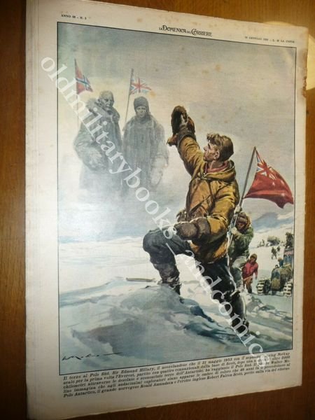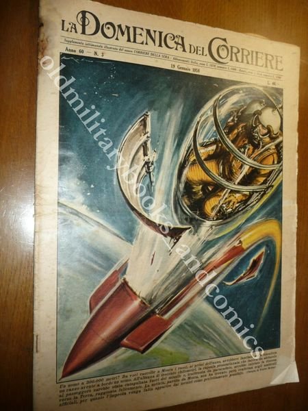 DESCRIZIONE: Domenica del Corriere, Milano, Anno 60 n. 3 (19 GENNAIO 1958). COPERTINA: Un uomo a 300.00 metri? I russi provano la conquista dello spazio. RETRO: Il terzo al Polo Sud. Sir Edmund HILLARY che scalo nel 1953 l'Everest dopo una marcia di 2000 Km ha raggiunto il Polo Sud. La Domenica del Corriere è stato un popolare settimanale italiano fondato a Milano nel 1899 e chiuso nel 1989. Apparve per la prima volta nelle edicole l'8 gennaio 1899 come supplemento illustrato del Corriere della Sera. Stampata in grande formato (sul modello del domenicale La Tribuna illustrata), aveva 12 pagine e veniva distribuita gratis agli abbonati del Corriere, oppure si poteva acquistare in edicola per 10 centesimi. La prima e ultima di copertina erano sempre disegnate. Il Corriere si avvaleva di un giovane disegnatore, Achille Beltrame, allora sconosciuto, a cui veniva affidato in ogni numero il compito di rendere con la sua tavola il fatto più interessante della settimana. Dopo la sua morte nel 1945, fu sostituito da Walter Molino che, come il suo predecessore, firmò memorabili copertine. A differenza dei settimanali dell'epoca, la Domenica del Corriere diede ampio spazio alle fotografie e ai disegni, e questo fu uno dei motivi del suo successo. CONDIZIONI: Discrete/Buone rivista con pieghe senza azzurrina, macchie di ruggine ad una spilletta. PESO / WEIGHT: 200 gr. without package