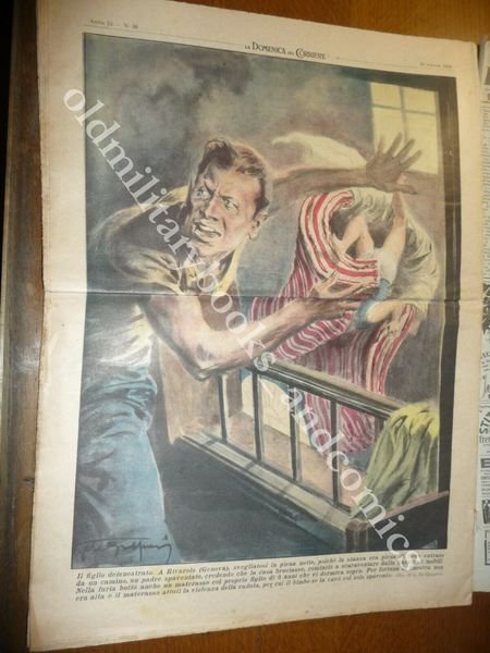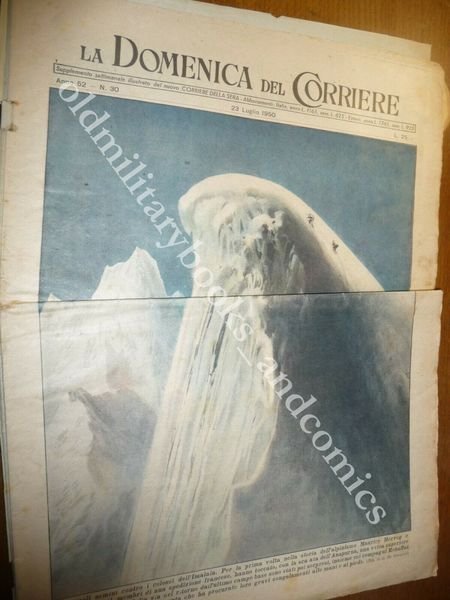 DESCRIZIONE: Domenica del Corriere, Milano, Anno 52 n. 30 (23 LUGLIO 1950). COPERTINA: Gli alpinisti Maurice HERZOG e Louis LACHENAL con una scalata sull'Anapurna conquistano una vetta superiore agli 8.000 mt. RETRO: A Rivarolo (Genova) per paura di un incendio getta il bimbo dalla finestra. La Domenica del Corriere è stato un popolare settimanale italiano fondato a Milano nel 1899 e chiuso nel 1989. Apparve per la prima volta nelle edicole l'8 gennaio 1899 come supplemento illustrato del Corriere della Sera. Stampata in grande formato (sul modello del domenicale La Tribuna illustrata), aveva 12 pagine e veniva distribuita gratis agli abbonati del Corriere, oppure si poteva acquistare in edicola per 10 centesimi. La prima e ultima di copertina erano sempre disegnate. Il Corriere si avvaleva di un giovane disegnatore, Achille Beltrame, allora sconosciuto, a cui veniva affidato in ogni numero il compito di rendere con la sua tavola il fatto più interessante della settimana. Dopo la sua morte nel 1945, fu sostituito da Walter Molino che, come il suo predecessore, firmò memorabili copertine. A differenza dei settimanali dell'epoca, la Domenica del Corriere diede ampio spazio alle fotografie e ai disegni, e questo fu uno dei motivi del suo successo. CONDIZIONI: Discrete/Buone rivista con azzurrina, ma evidente piega centrale. PESO / WEIGHT: 200 gr. without package