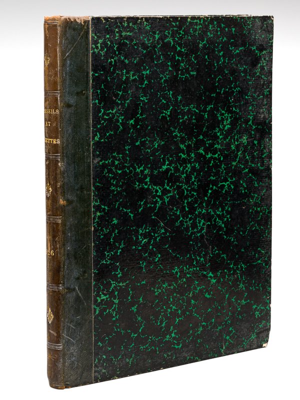 1 vol. in-4 reliure uniforme demi-basane verte, dos lisse orné, environ 92 feuillets : Conseils et Recettes [ Année 1926 : plus de 1000 recettes et conseils pratiques recueillis en 1 volume, avec table des matières manuscrite ] Etonnant et impressionnant recueil de plus de 1000 recettes et conseils pratiques, en autant d'articles contrecollés, découpés dans des journaux de l'époque non identifiés. Chaque volume est pourvu d'une table des matières manuscrites, qui recense par ordre alphabétique les innombrables recettes et conseils pratiques ; les recettes sont beaucoup plus nombreuses que les conseils pratiques (probablement 9 recettes pour un conseil pratique) : tanches farcies ; soupe brunoise à l'orge, taches de jus de groseilles, soufflé aux chicorées, rouget-grondin saue tartare, cardons à la poulette, colin Cyrano, blinis à la russe, omelette aux pommes, râble de lièvre à la Picarde, le Mègre, gâteau Sylvia, sole normande à la mode du pays de Caux, poitrine de veau provençale, etc. Bon état.