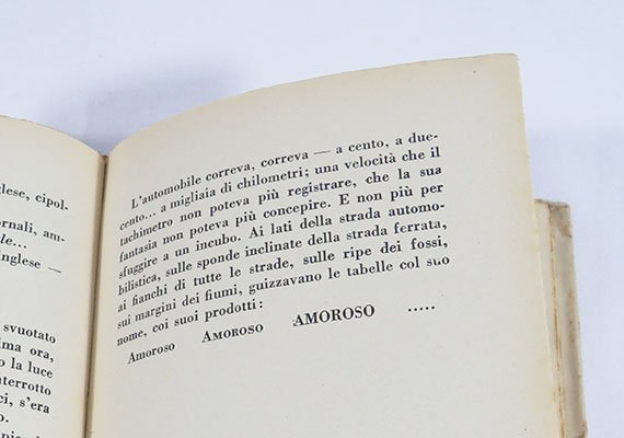 LIBROPrima edizione. Ottimo esemplare.Romanzo con diverse soluzioni parolibere, tra cui la bella tavola ‘Cavoli’ su doppia pagina. Mappa in antiporta e una doppia tavola parolibera nel testo.Cammarota, Futurismo, 103.1