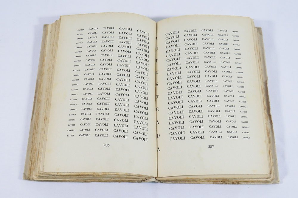 - cartonato muto con sovracoperta risvoltata a tamburo interamente disegnata in verde e nero in stile modernista (rielaborazione visisva della tavola parolibera “Cavoli” alle pp. 286-7),