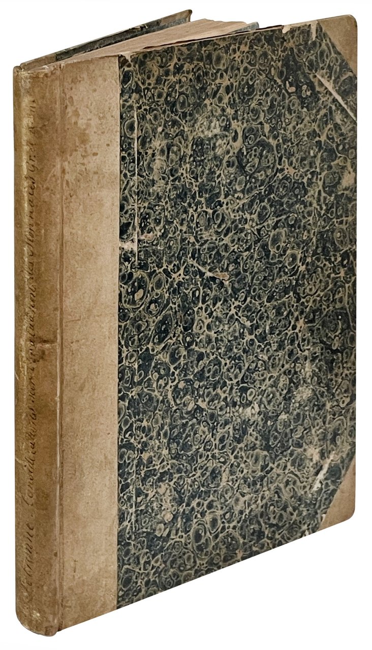 In 4to (mm 240x197); pp. VIII, 144. Carta leggermente ed uniformemente brunita, lievi fioriture. Mezza pergamena coeva con punte, piatti rivestiti con carta marmorizzata. Titolo manoscritto al dorso. Risguardi in carta marmorizzata e tagli picchiettati. Nota di possesso manoscritta all'occhietto. Ottimo esemplare.PRIMA EDIZIONE di questa dissertazione letta davanti all'Académie Royale des Inscriptions et Belles-Lettres, di cui l'autore era membro, nelle sedute del 30 maggio, 13 e 27 giugno e 11 luglio 1817, in risposta alla memoria del conte Garnier.