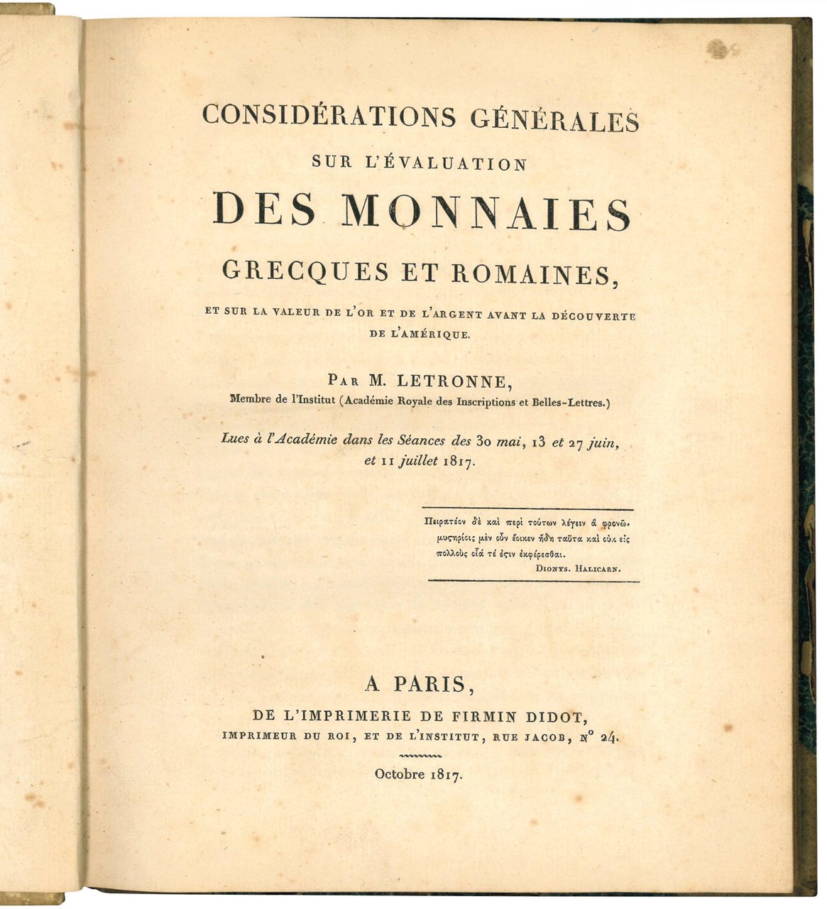 Considérations générales sur l'évaluation des monnaies grecques et romaines, et sur la valeur de l'or et de l'argent avant la découverte de l'Amérique. Par M. Letronne, Membre de l'Institut (Académie Royale des Inscriptions et Belles-Lettres.)