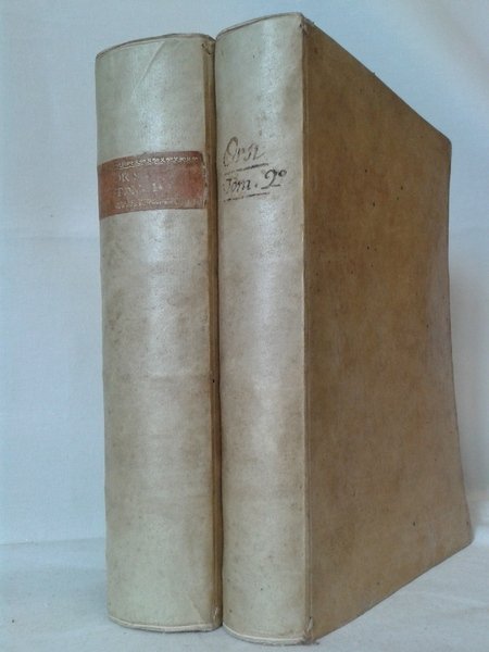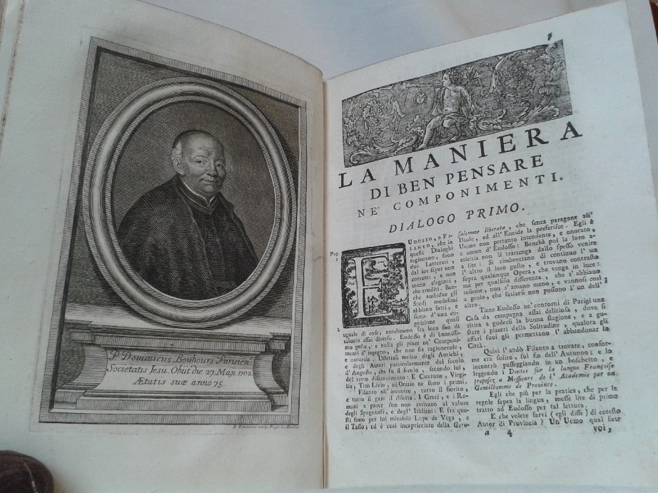Opera in due volumi in 4, legatura coeva in pergamena, titoli al dorso, ex libris figurato al verso del piatto, sguardie, 2 magnifiche tavole xilografiche in antiporta (una animatissima scena allegorica al primo volume ed un grande stemma araldico al secondo), frontespizi, prefazione e dedicatoria ad Antonio Rambaldo, XIX, (1), 1 tavola f.t. con ritratto dell'autore, occhiello, altra prefazione, 1 tavola con ritratto del gesuita Bouhours, 726, XXIV, 648 pp., testatine ornate, capilettera istoriati e finalini xilografici ornamentali a piena pagina. I due volumi raccolgono i testi di quella che Toffanin nel suo studio sull'Arcadia defin 'la prima polemica letteraria internazionale', che vide alcuni tra i maggiori eruditi e letterati italiani del tempo, tra i quali Eustachio Manfredi e Girolamo Baruffaldi, guidati dall'Orsi, schierarsi contro il gesuita francese Dominique Bouhours, che nel suo trattato sulla 'Maniera di ben pensare ne' componimenti' (1687) aveva accusato la tradizione poetica italiana di mancanza di verit e di eccesso di retorica. Come noto, anche il trattato 'Della perfetta poesia italiana' del Muratori (pubblicato anch'esso da Soliani, stampatore ducale a Modena, nel 1706) era stato in origine concepito come replica al padre Bouhours: cfr. il volume dedicato al Settecento nella 'Storia della letteratura italiana' diretta da Enrico Malato per l'editore Salerno. Splendida rara edizione, stampata su ottima carta vergata, ancor fresca e frusciante, molto curata editorialmente ed arricchita dalle 4 tavole f.t. e dai numerosi fregi ornamentali. In perfetto stato.