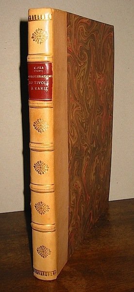 4to (cm. 28,5), 2 cc.nn., IV-184 pp. con 4 tavole calcografiche più volte ripiegate in fine. Ottima legatura recente in mz. pelle con nervi, fregi e titolo oro su tassello rosso al ds. Conservate all’interno le copertine editoriali (con alcune mancanze). Ottimo esemplare in barbe. Scritti interessanti su Tivoli e varie località del Lazio (Pantano, Ostia, Porta Capena, ecc.). Lozzi, II, p. 316 (con sole 3 tavv.).