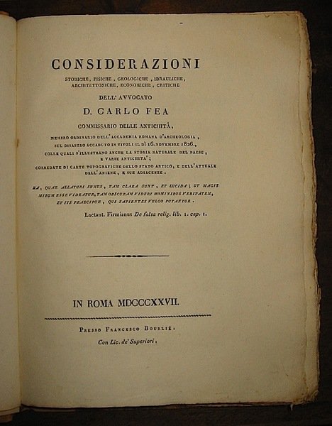 Considerazioni storiche, fisiche, geologiche, idrauliche, architettoniche, economiche, critiche. sul disastro accaduto in Tivoli il dì 16 novembre 1826, colle quali si illustrano anche la storia naturale del paese e varie antichità; corredate di carte topografiche dello stato antico, e dell’attuale dell’Aniene, e sue adiacenze