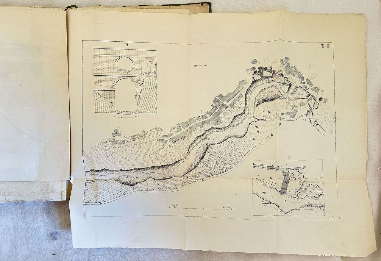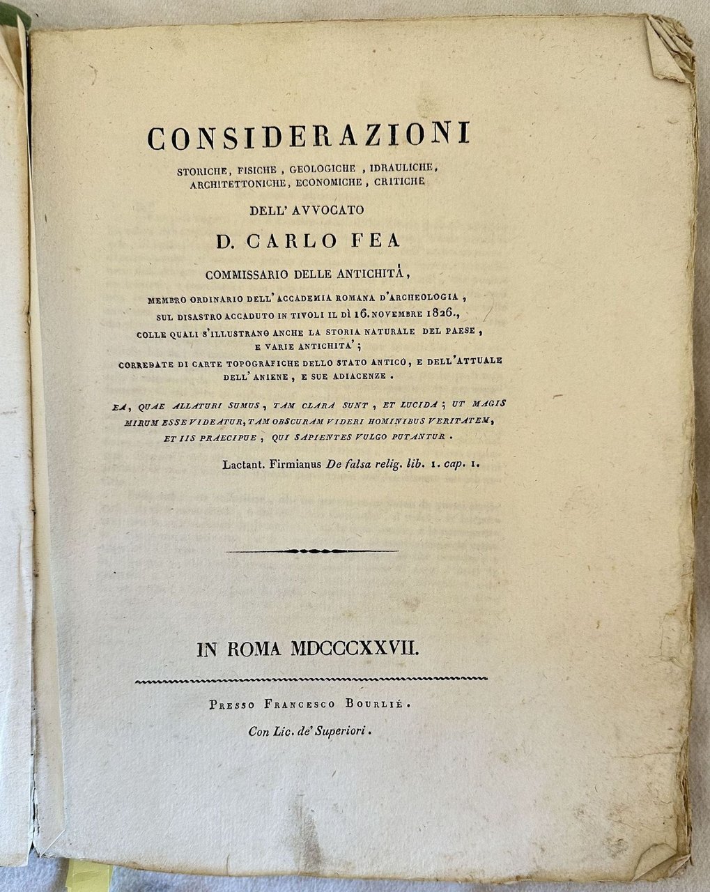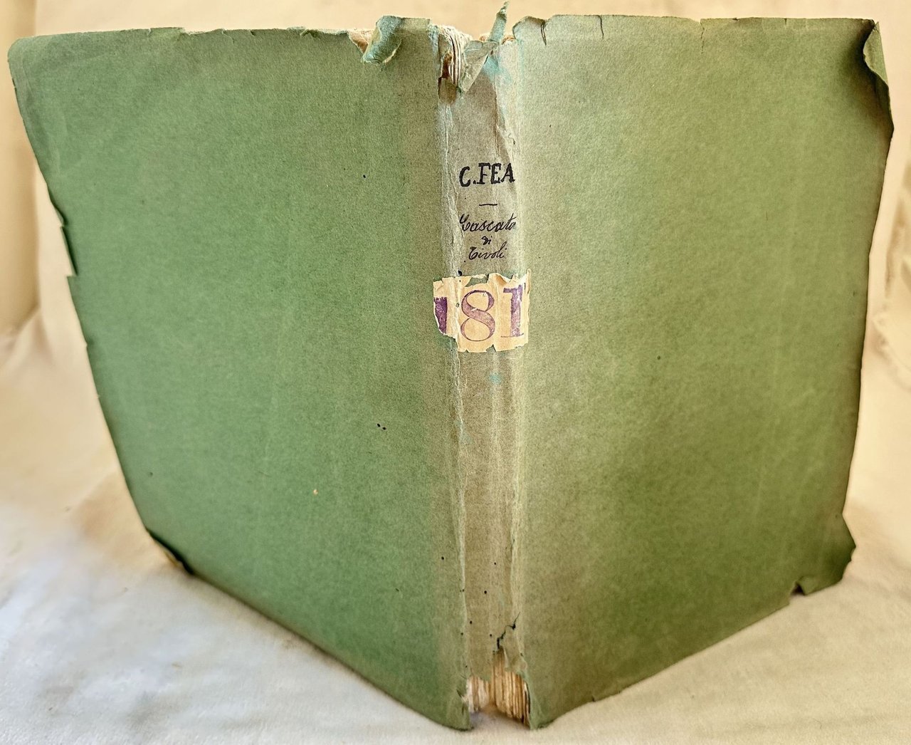 Rara raccolta di sette pubblicazioni dell'avvocato, archeologo e collezionista d'arte Carlo Fea (Pigna 1753-Roma 1836). Fea fu direttore del Museo Capitolino e Commissario delle Antichità di Roma. Si occupò di razionalizzare la legislazione sul commercio in antichità e sugli scavi archeologici e intraprese opere di scavo al Pantheon e Foro Romano. <BR><BR>Miscellanea di studi che parla soprattutto di Tivoli ma anche diffusamente di Ostia, Fiumicino, la Valle della Caffarella e altri luoghi limitrofi. Lozzi 5354. Bocca 5958 (solo il primo articolo sul disastro di Tivoli)<BR><BR>Le memorie contenute: Considerazioni storiche, fisiche geologiche, idrauliche, architettoniche economiche critiche sul disastro accaduto in Tivoli il di 16 novembre 1826; Schiarimenti ai Signori professori del Consiglio d'arte sulle Difficoltà che i medesimi hanno proposte nel loro parere intorno al pogetto dell'autore per rimediare a quelle rovine; Parere e progetto del consiglio d'arte sulla riparazione della rotta dell'Aniene a Tivoli esaminato; Osservazioni sopra il condotto dell'acqua felice nella sua origine a Pantano per rimediare ai danni che vi sono nella quantita e qualita dell'acqua; Supplemento alle notizie date nella relazione d'un viaggio a Ostia e nelle osservazioni sulla Fossa Traianna intorno al canale detto Fiumicino; Scoperta dell'antica acqua di Mercurio presso la Porta Capena da condottarsi a benefizio pubblico; Un lago salutare degli antichi fuori la Porta Capena scoperto nel cosi detto antro della Ninfa Egeria ossia Fontana Bella nella Valle della Caffarella.<BR><BR>Alla fine dell'opera quattro tavole ripiegate.<BR><BR>In buone condizioni.<BR><BR>Copertina morbida coeva con titolo manoscritto al dorso in buone condizioni general con lievi usure marginali. Legatura in buone condizioni. Pagine in ottime condizioni con rare fioriture. In 4. cm 30x23. Pp. IV+184+4 pl.